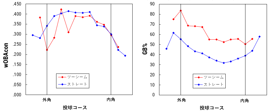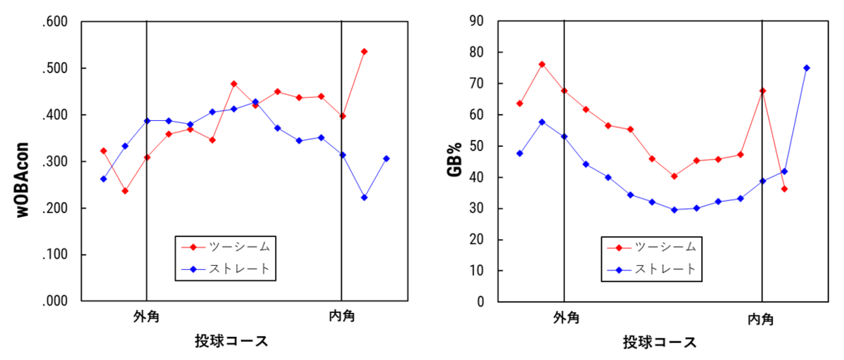 参考までに、左右一致時のwOBAcon分布とGB%分布をFig.3に示す。内角に食い込むツーシームは弱い打球を打たせやすいとよく言われるが、wOBAconでみると実はストレートとほとんど変わらない。GB%でみると確かにツーシームの方が高いが、それは外角でも同じことが言える。