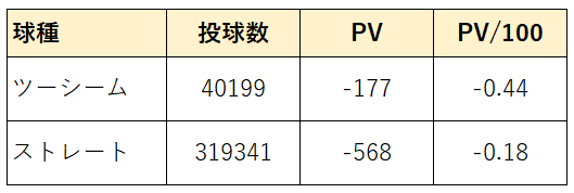 - 平均的なツーシームは平均的なストレートよりもPitchValueが低い(失点リスクが高い)傾向にある。