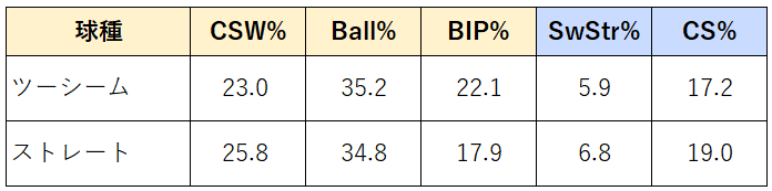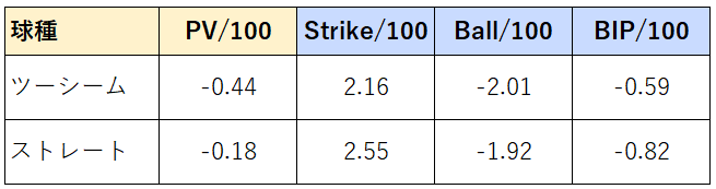 Pitch Value計算では、カウントによってストライクの得点価値を変動させており、同じストライクでも2S時のストライクは非常に価値が高いものとして計算される。ツーシームはこのような価値の高いストライクを獲得しにくいため、低いStrike/100に繋がっていると思われる。