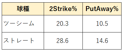 ツーシームのストライク奪取について、もう1点触れておきたい。Table.4に全投球のうち2ストライクで投じられた割合(2Strike%)を示す。ツーシームの2Strike%は低く、2ストライクの場面であまり積極的に投じられていなかったことがわかる。PutAway%は2ストライク時に投じた球がストライク(三振)となった割合を示しているが、ツーシームのPutaway%は低く、決め球としてあまり有効ではなかったことがうかがえる。