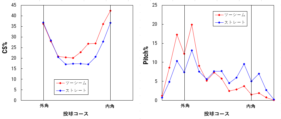 *4:ちなみに全投球に占めるファウルによるストライクの割合はツーシームが13.8%、ストレートが12.9%とツーシームの方がわずかに有利だが、総ストライク数の関係はストレート>ツーシームで変わらない。